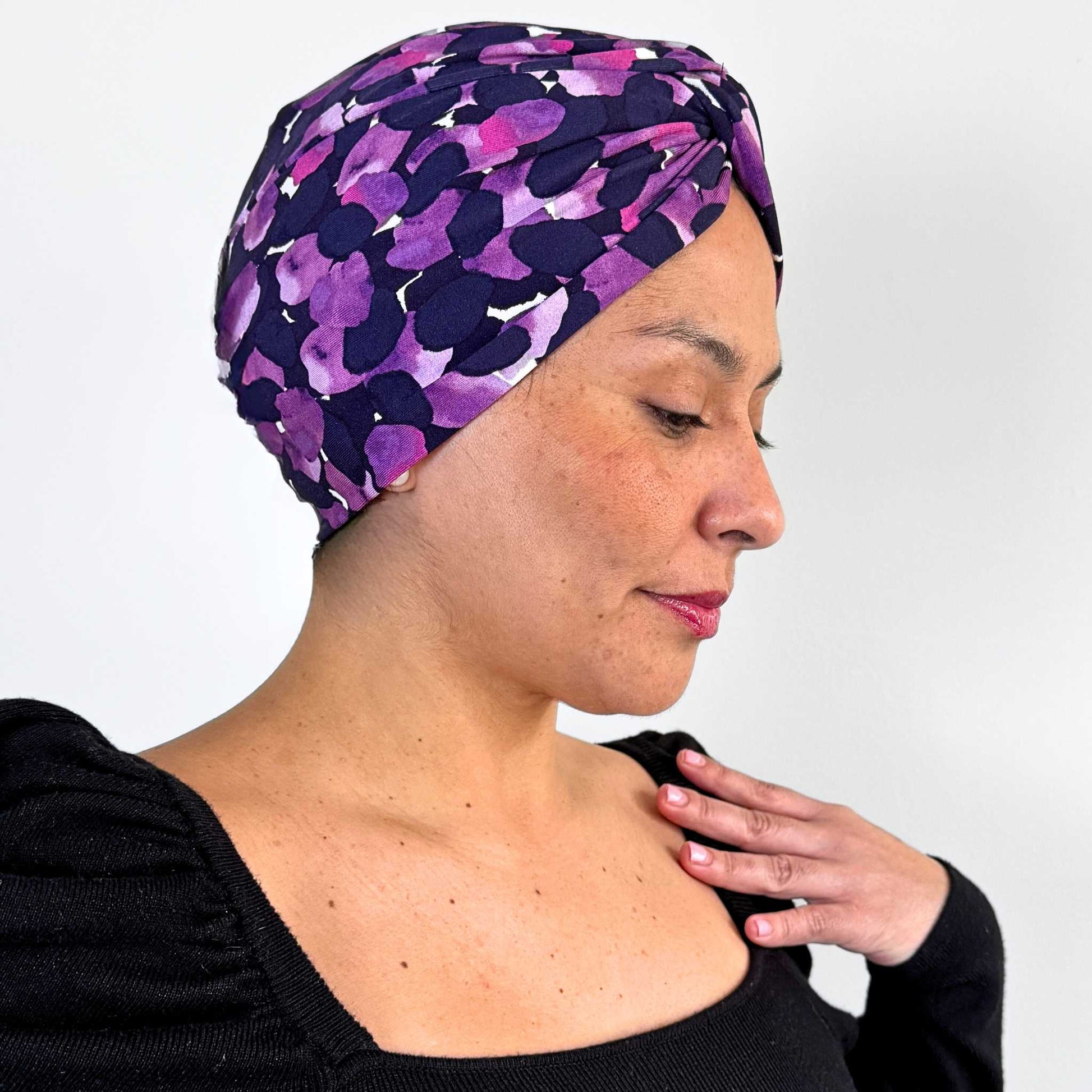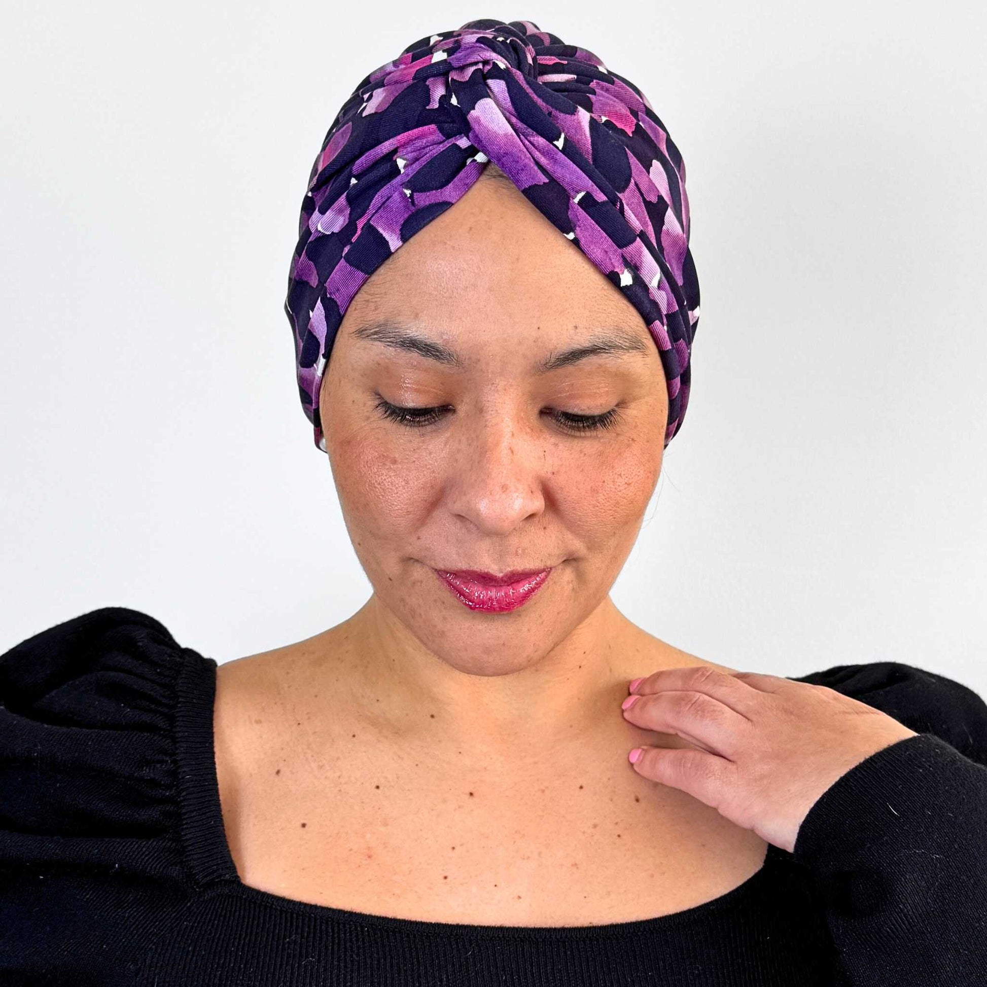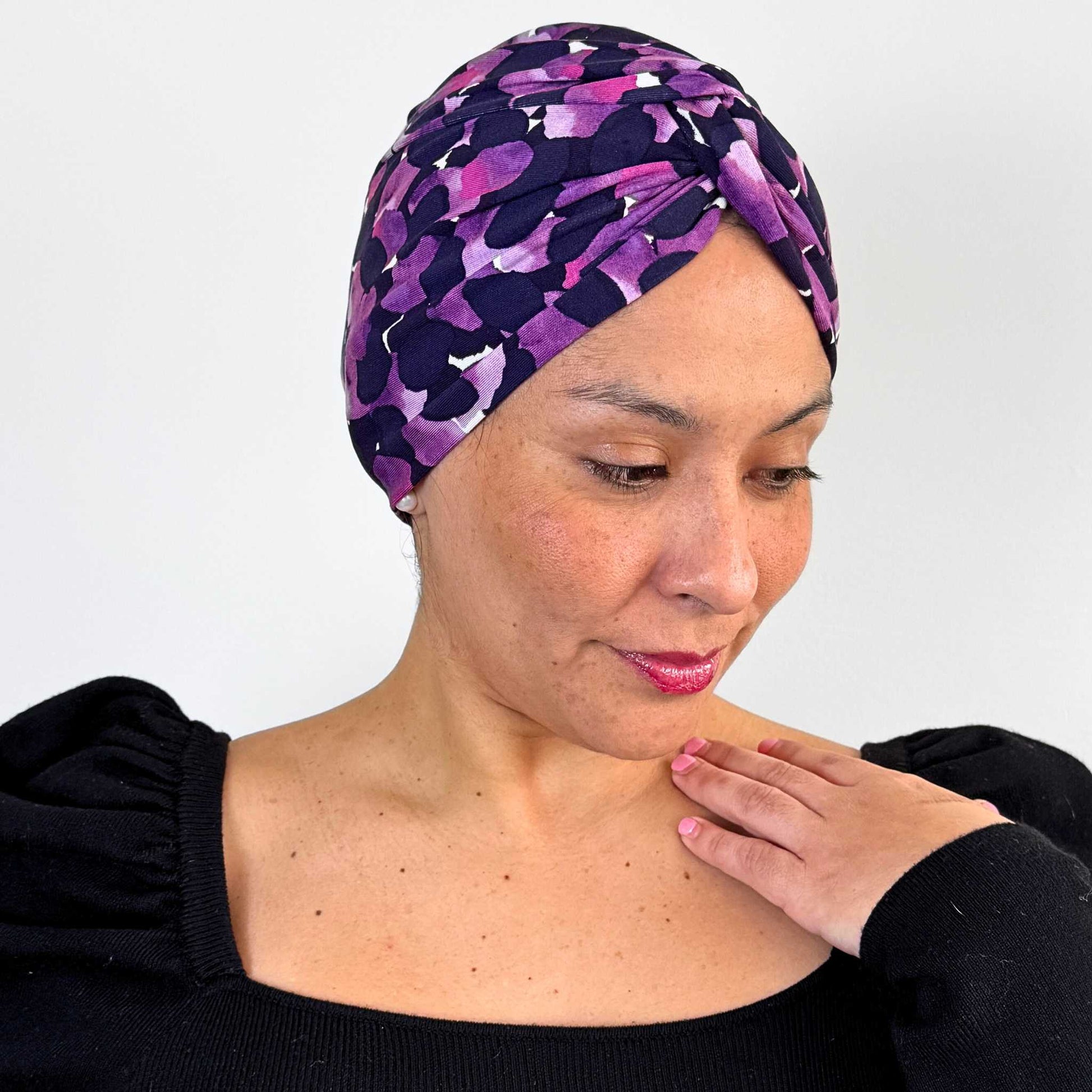 Thank you so much for my beautiful Vintage Bow Turban Cap. It's so soft and fits perfectly. The colours are gorgeous and flattering. I feel confident and pretty again 💜